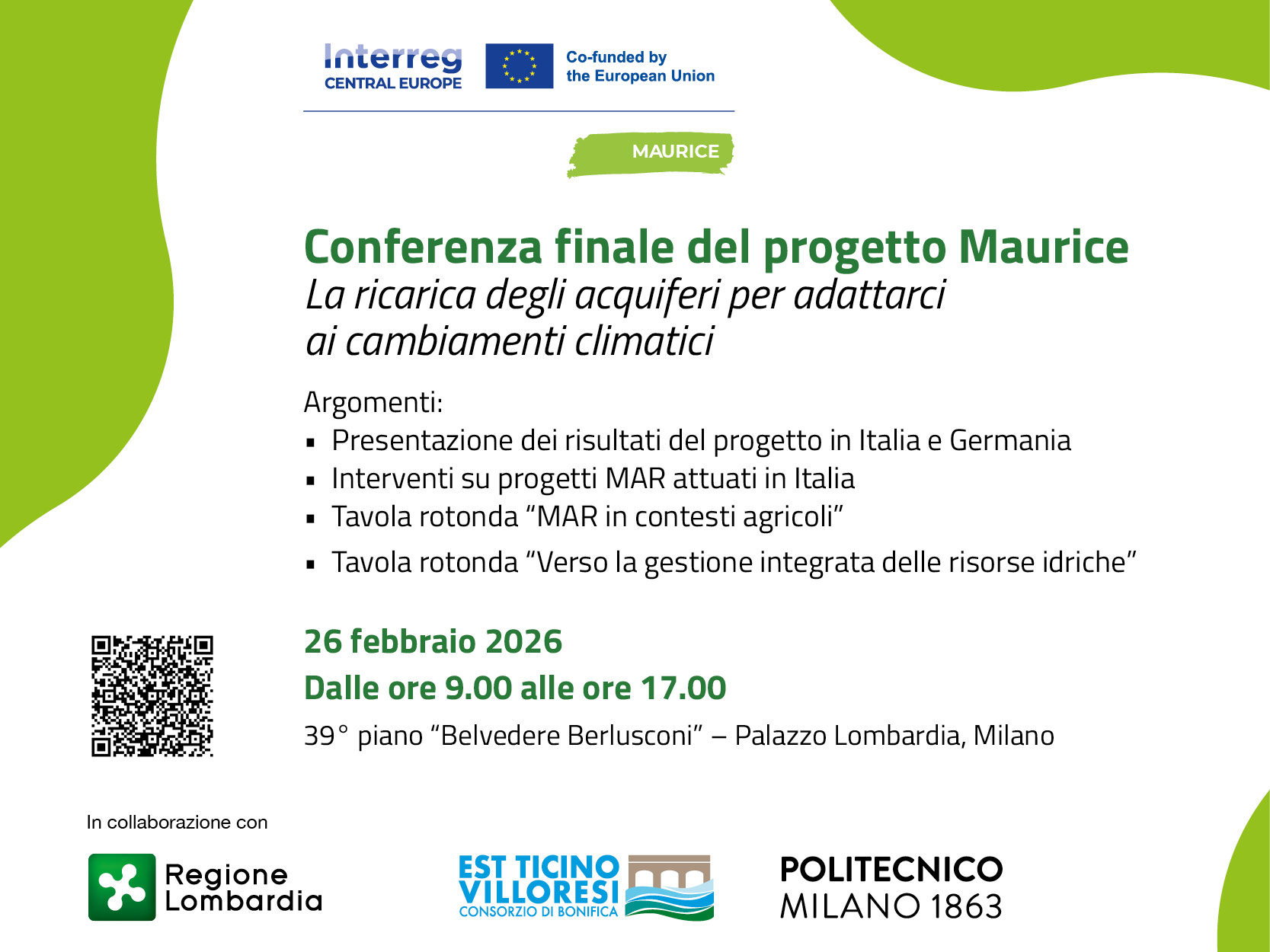 Il 26 febbraio 2026, presso il Palazzo Lombardia, Sala Belvedere “Silvio Berlusconi” (39° piano, ingresso N1), si svolgerà una conferenza per la presentazione dei risultati del progetto e lo scambio di conoscenze sull’attuazione della ricarica artificiale di acquiferi (MAR) in Italia. L’obiettivo è presentare tali interventi come misure di adattamento ai cambiamenti climatici che rendano le nostre risorse idriche più resilienti attraverso l’immagazzinamento di acqua nel sottosuolo.